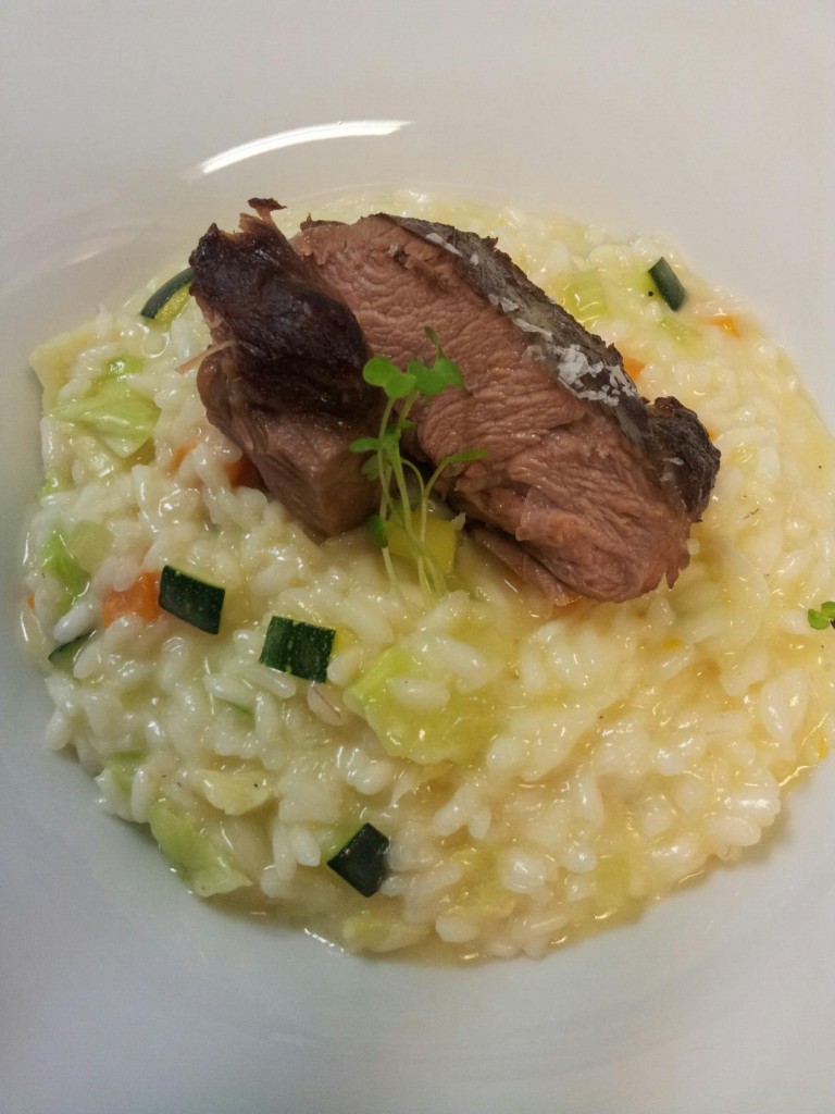 Az ebéd egyik csúcspontja: sous-vide borjú, alatta zöldséges rizottó – ismét a kiváló alapanyag, amit nem rontottak el semmilyen flik-flakkal, saját ízeivel volt pompás.